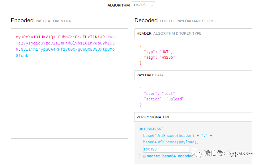 {"typ": "JWT", "alg": "HS256"}.{"user": "admin","action": "profile"}.[新的签名]