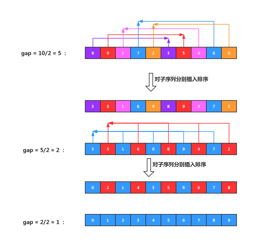 gap = len / 2,随后每次循环gap = gap / 2,直到减为1,循环终止。增量gap的意义是将序列分为多少子序列。 - 希尔排序存在非相邻元素交换位置,所以希尔排序是不稳定排序。