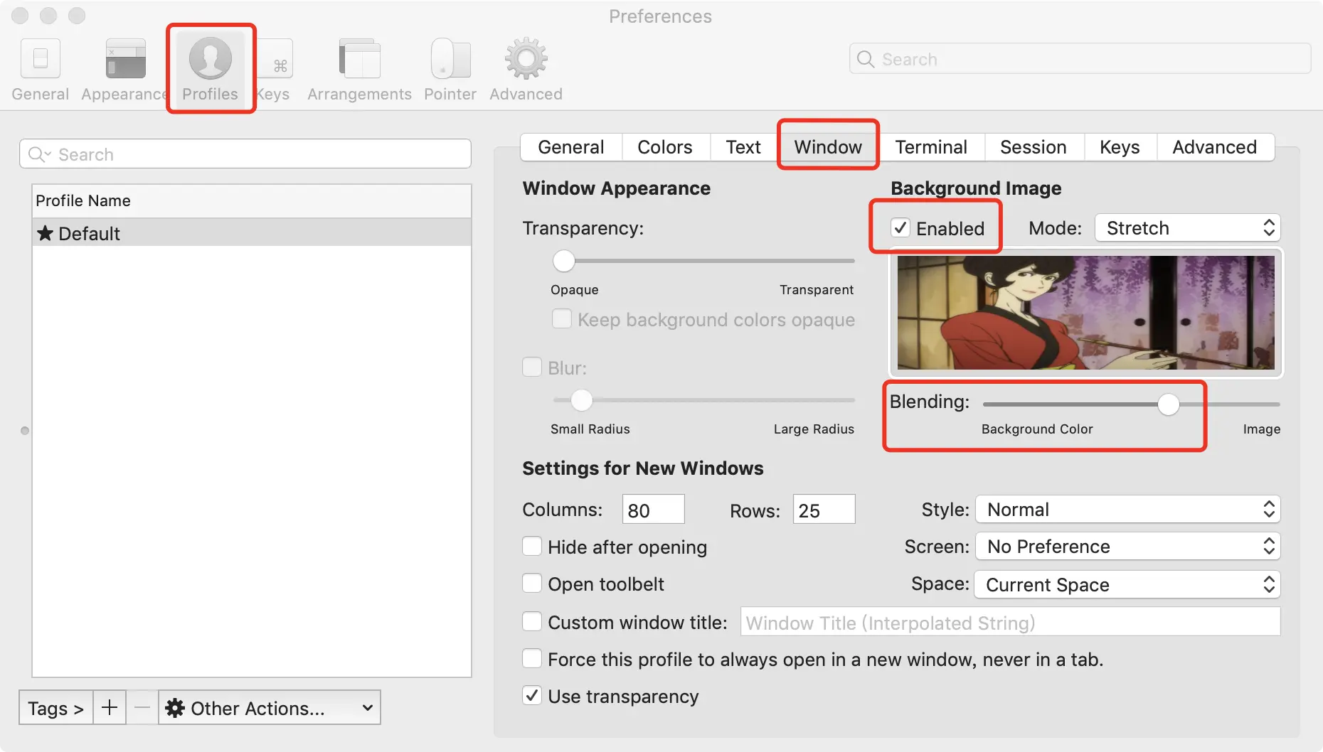 iTerm2 -> Preferences -> Profiles -> Window -> Background Image -> Enabled