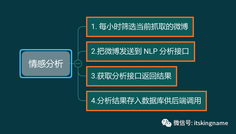 最后一个需求,对微博数据进行情感分析。情感分析的模块由别的部门同事开发,你要做的就是每个小时拉取一批数据,发送到接口,获取返回,然后存入后端需要的数据库: