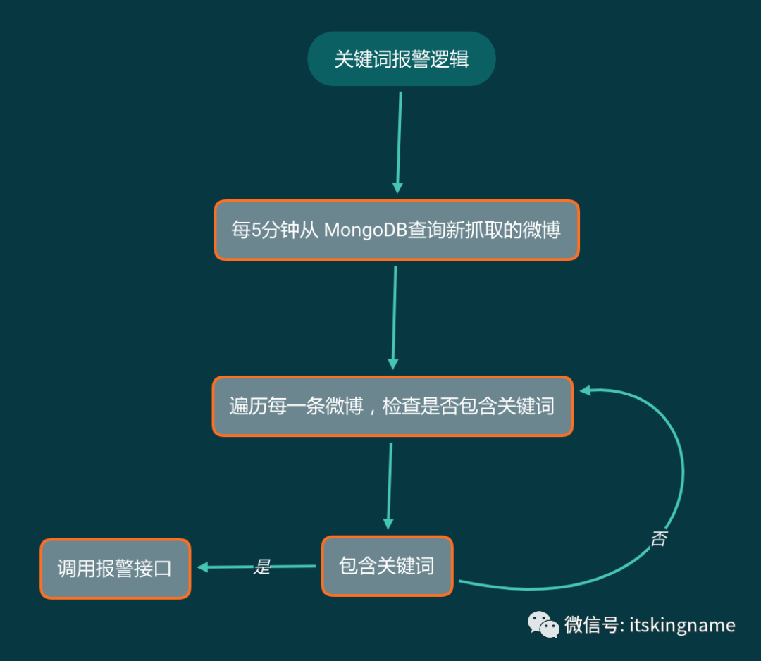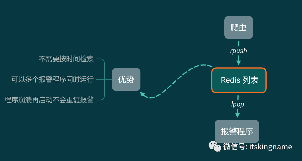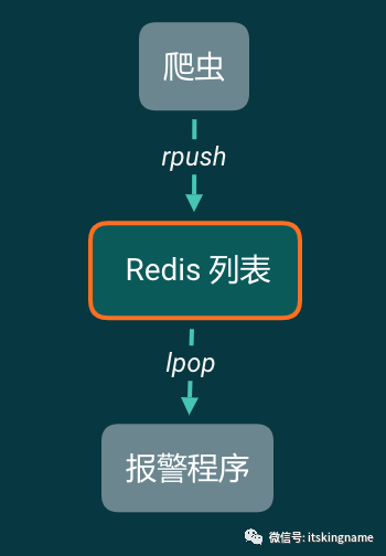 爬虫爬下来的数据,直接塞进 Redis 的列表右侧。报警程序从 Redis 列表左侧一条一条读取。读取一条检视一条,如果包含报警关键词,就报警。然后读取下一条。