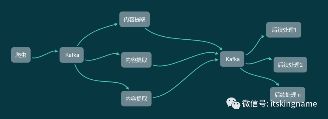 把 Kafka 加入到你的爬虫流程中,那么你的爬虫架构变成了下面这样: