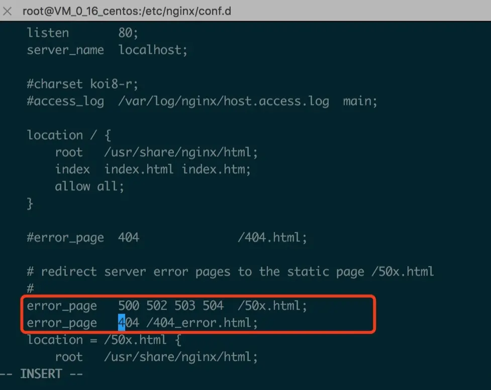 添加一个 error_page 配置,然后再去配置 /usr/share/nginx/html 里面的 404_*error.html