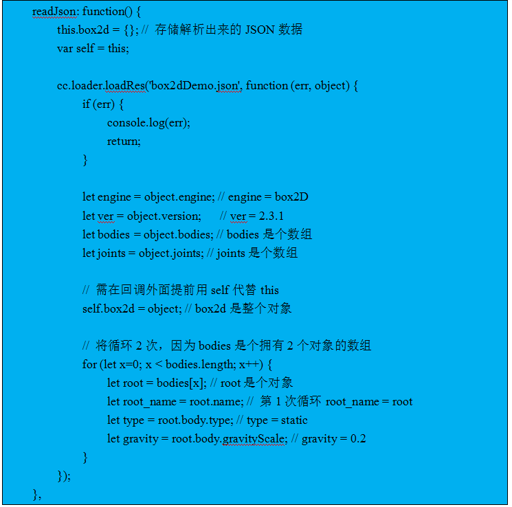 我们在代码中定义一个解析函数叫 readJson,并且把解析出来的JSON数据保存起来,实现代码如下: