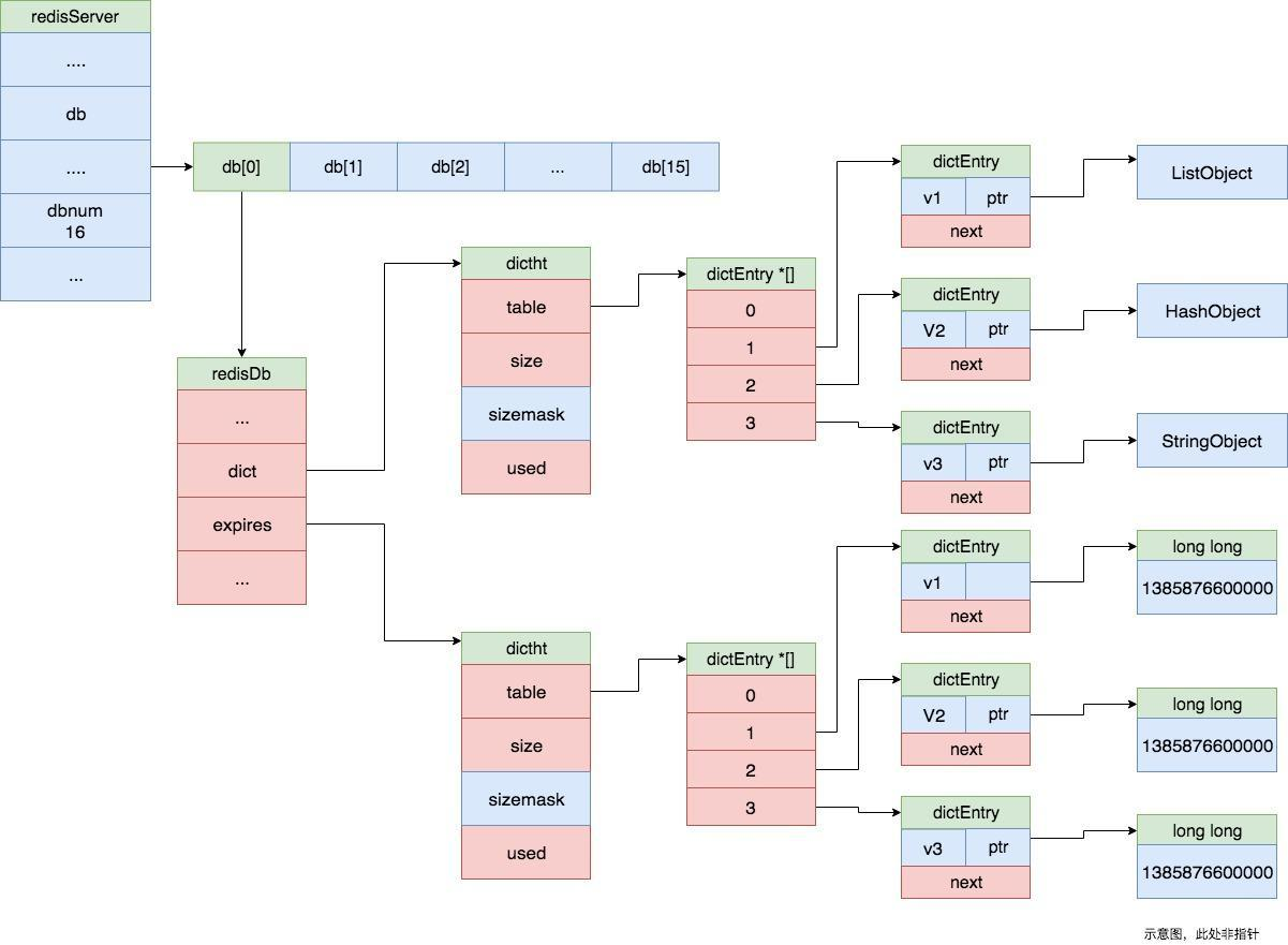 具体 setKey 和 setExpire 的方法实现我们这里就不细讲,其实就是将键值添加到db的 dict 数据哈希表中,将键和过期时间添加到 expires 哈希表中,如下图所示。