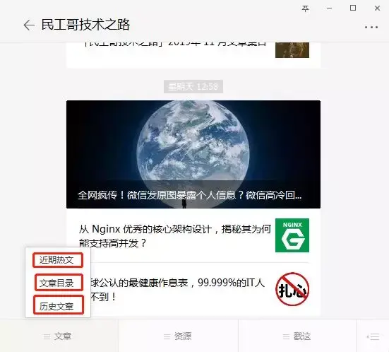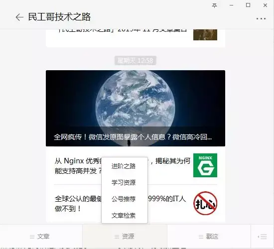 文章检索:这个就提供了可以搜索公众号所有文章的入口,只要你有需要,可以直接在这里搜索公众号历史发过的相关技术文章,非常方便。