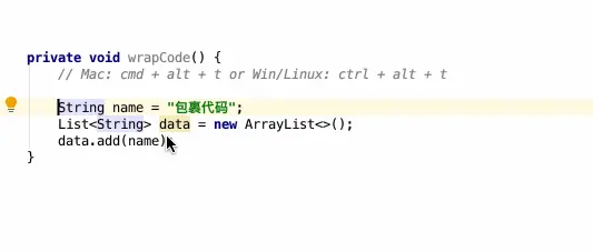 | 包裹代码 | Mac: Cmd + Alt + T Win/Linux: Ctrl + Alt + T |