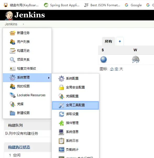 Jenkins第一次进入推荐安装的插件就默认安装就行。至于java和git、maven接下来需要手动指定 点击左上角下拉菜单,找到『系统管理』,『全局工具配置』(话说这个入口藏得忒深!)