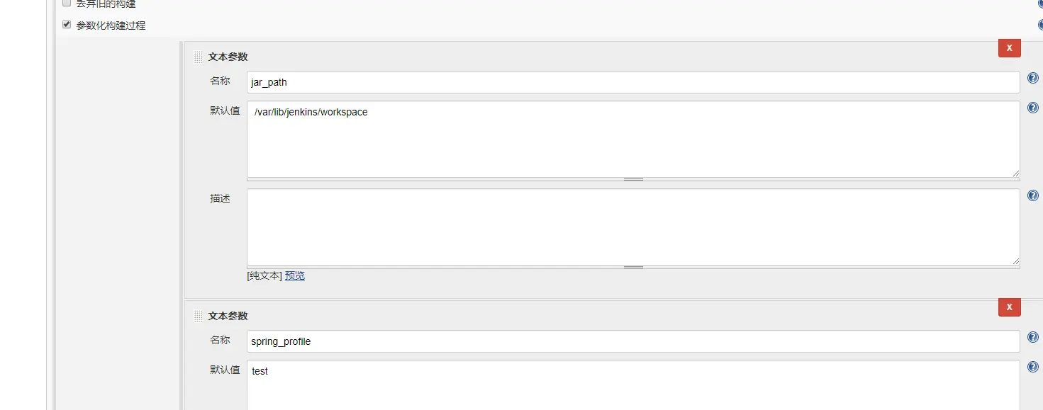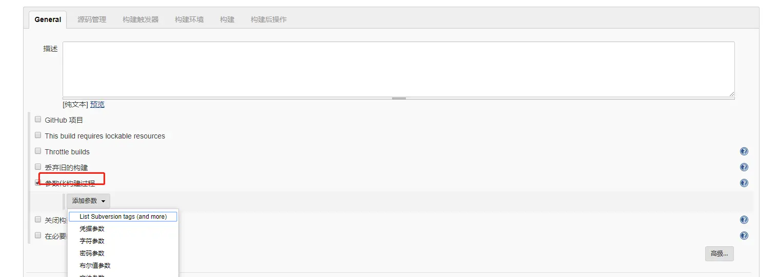 2. 勾选『参数化构建过程』,点击点击参数,选择『文本参数』