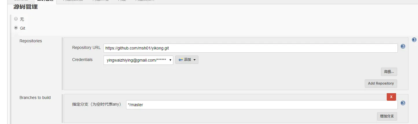 3. 添加git源码仓库地址,以及对应的账号密码(或者鉴权key)