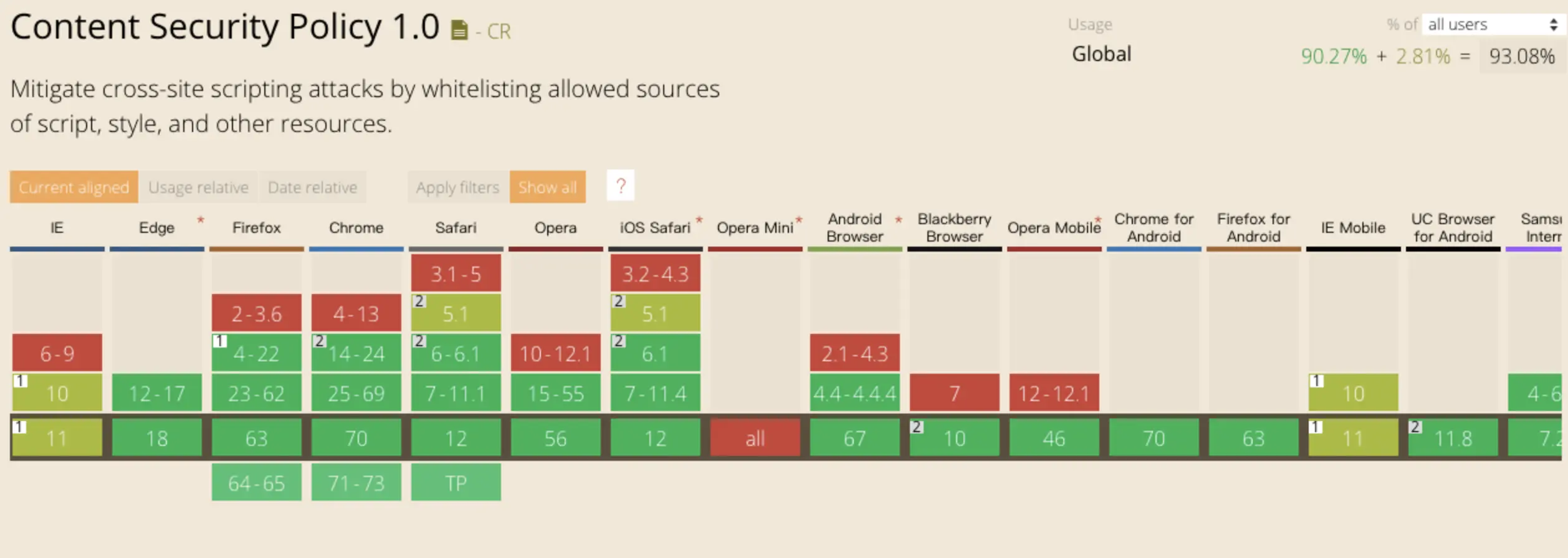 对于这种方式来说,只要开发者配置了正确的规则,那么即使网站存在漏洞,攻击者也不能执行它的攻击代码,并且 CSP 的兼容性也不错。