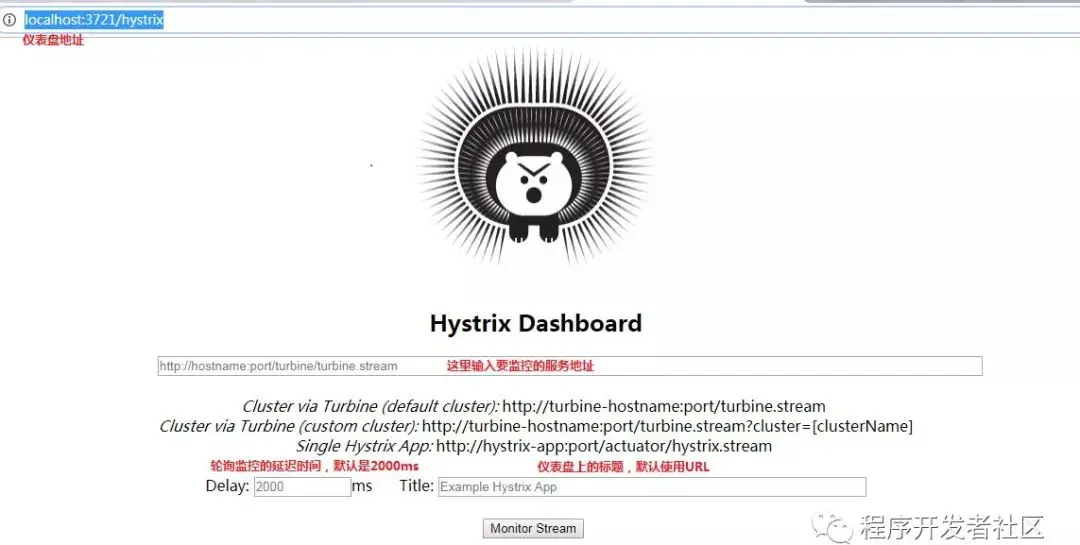 4、端口配置为3721,到此我们的hystrix监控服务就搭建完毕了,启动访问http://localhost:3721/hystrix