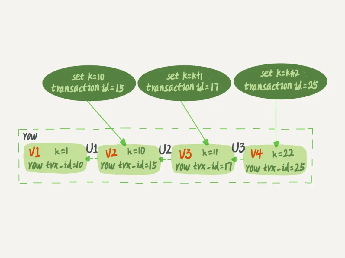 图中虚线框里是同一行数据的 4 个版本,当前最新版本是 V4,k 的值是 22,它是被 transaction id 为 25 的事务更新的,因此它的 row trx_id 也是 25