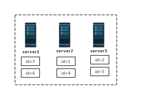所以经过哈希算法之后,id=3、id=6 的数据与 master 节点数取模为 0 (3%3=0,6%3=0),所以这两个数据会存放到 server1 服务器 ,以此类推,id=1、id=4 的数据将存放到 server2 服务器中,id=2、id=5 的数据将存放到 server3 上,这时候服务器存储数据如下图所示: