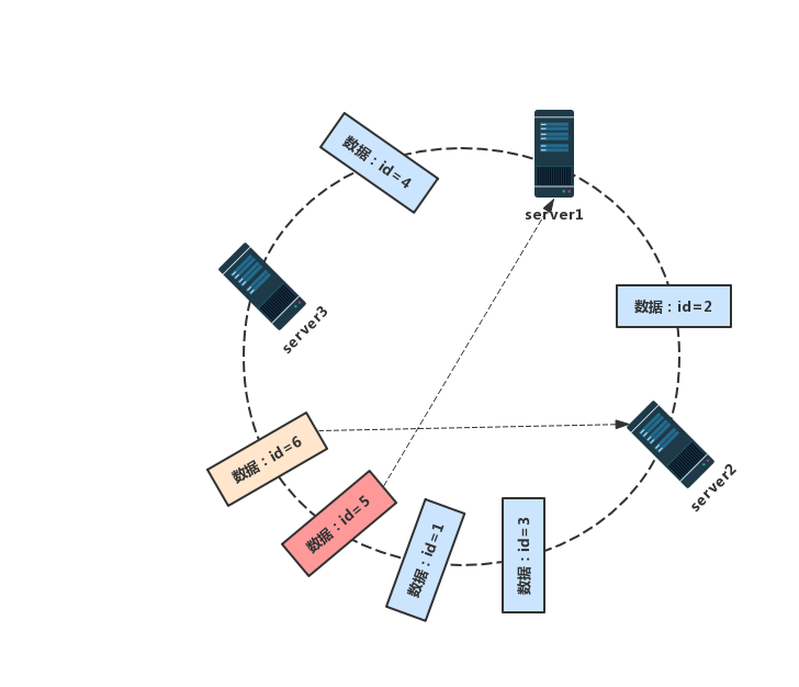 落到虚拟节点上的数据都会存到对应的物理服务器上,所以通过带虚拟节点的一致性哈希算法后,数据存储结果为:数据id=2、id=3、id=5 的数据都会存储到服务器server1 上,id=1 的数据将会存储到服务器server2 上,数据 id=4、id=6 都会存放到服务器server3上。