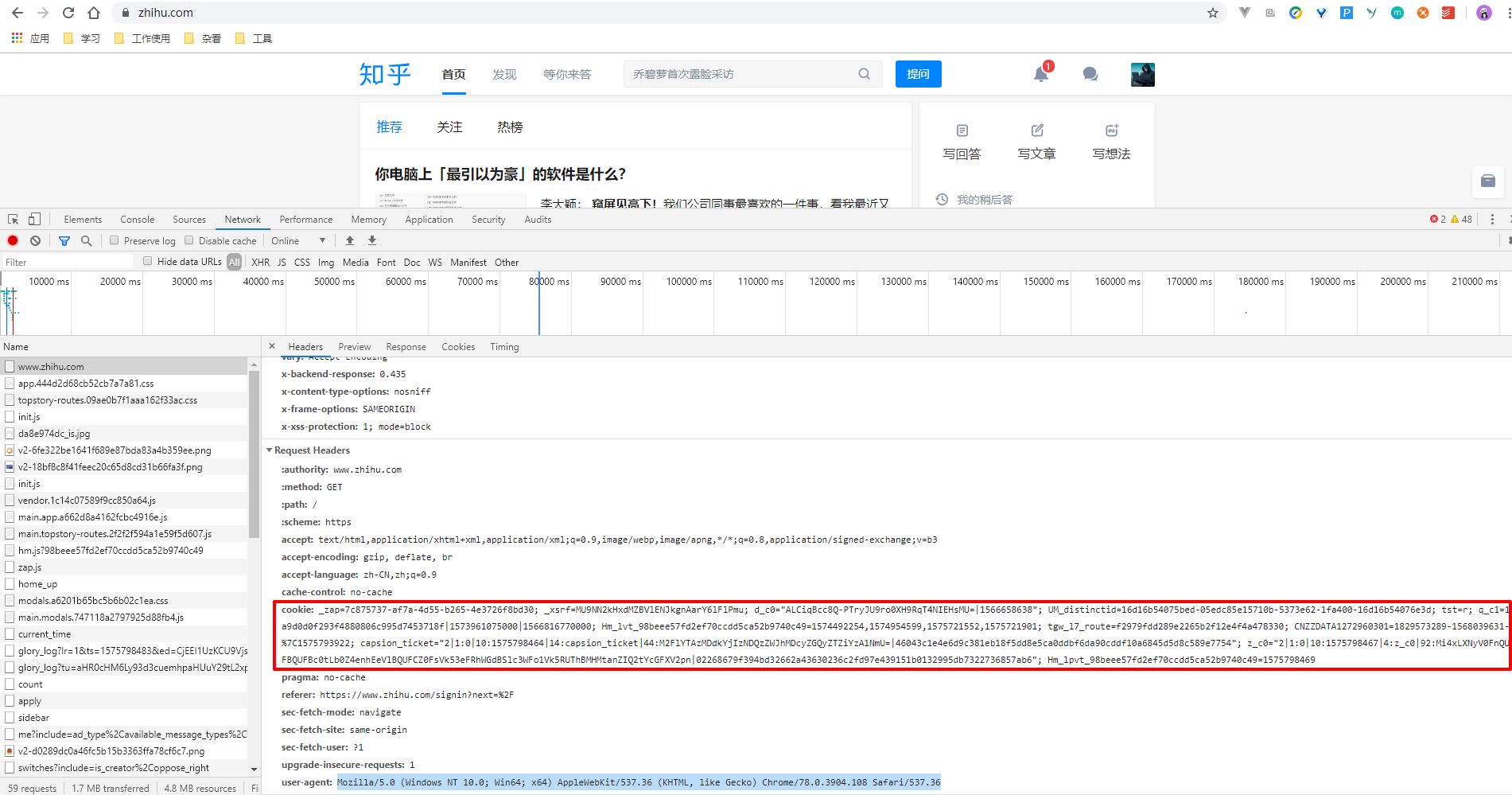 我们打开浏览器,登录知乎,打开 F12 开发者模式,看下我们登录后的 Cookies 是什么。