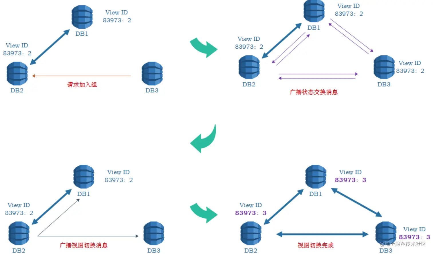 MGR以组视图(Group View,简称视图)为基础来进行成员管理。视图指Group在一段时间内的成员状态,如果在这段时间内没有成员变化,也就是说没有成员加入或退出,则这段连续的时间为一个视图,如果发生了成员加入或退出变化,则视图也就发生了变化,MGR使用视图ID(View ID)来跟踪视图的变化并区分视图的先后时间。