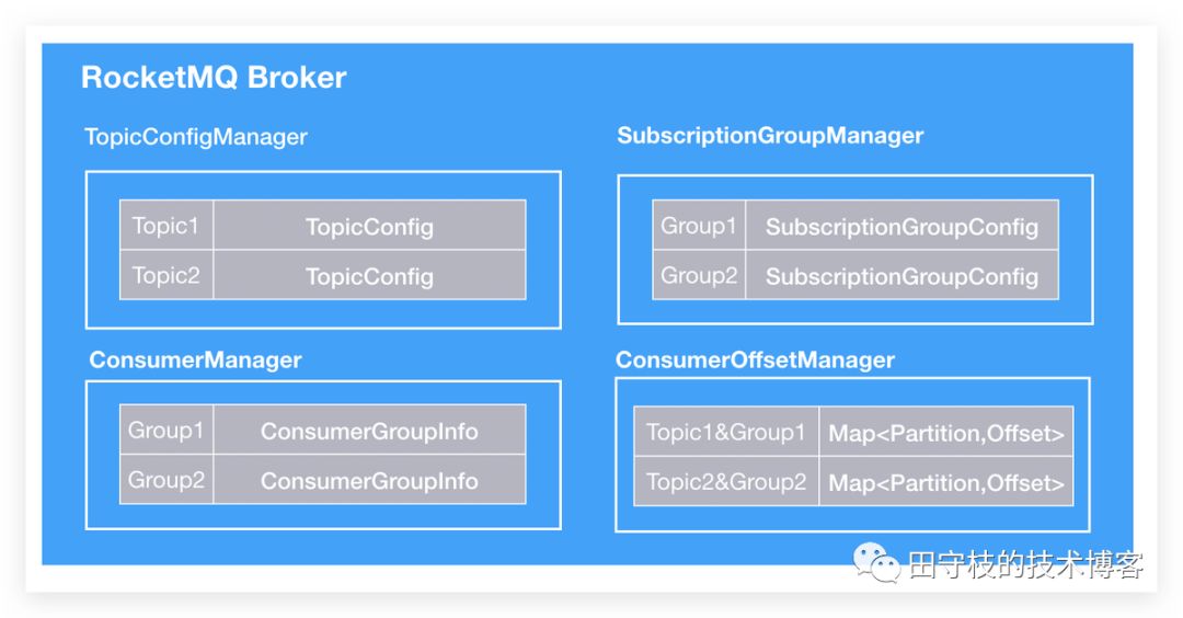 消费者组信息:由ConsumerManager、ConsumerOffsetManager、SubscriptionGroupManager三者共同维护。ConsumerManager维护了消费者组订阅信息,以及消费者组下当前的消费者实例信息,当消费者组的订阅信息或者实例发生变化,Broker都会主动给所有消费者实例发送通知,触发Rebalance。而在Rebalance时,消费者需要从ConsumerOffsetManager查询应该从那个位置继续开始消费。SubscriptionGroupManager主要是维护消费者组的一些附加信息,方便运维。