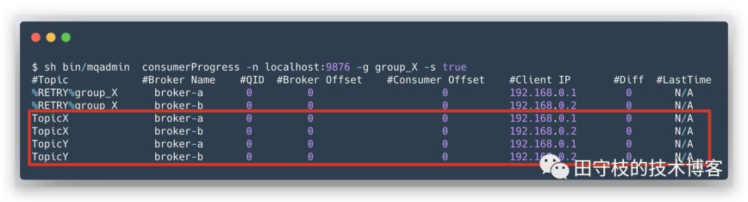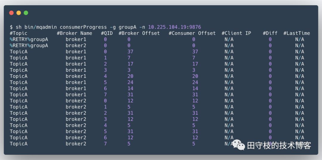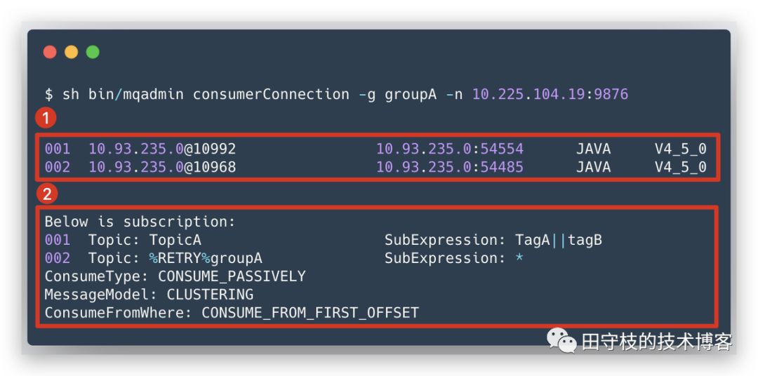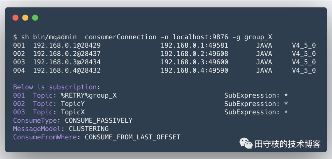 消费者可以向任意一个Broker发送GET_CONSUMER_LIST_BY_GROUP请求,来获得一个消费者组下的所有消费者实例信息。 我们可以通过mqadmin命令行工具的consumerConnection子命令,来查看某个消费者的信息,如:输出主要分为2个部分: