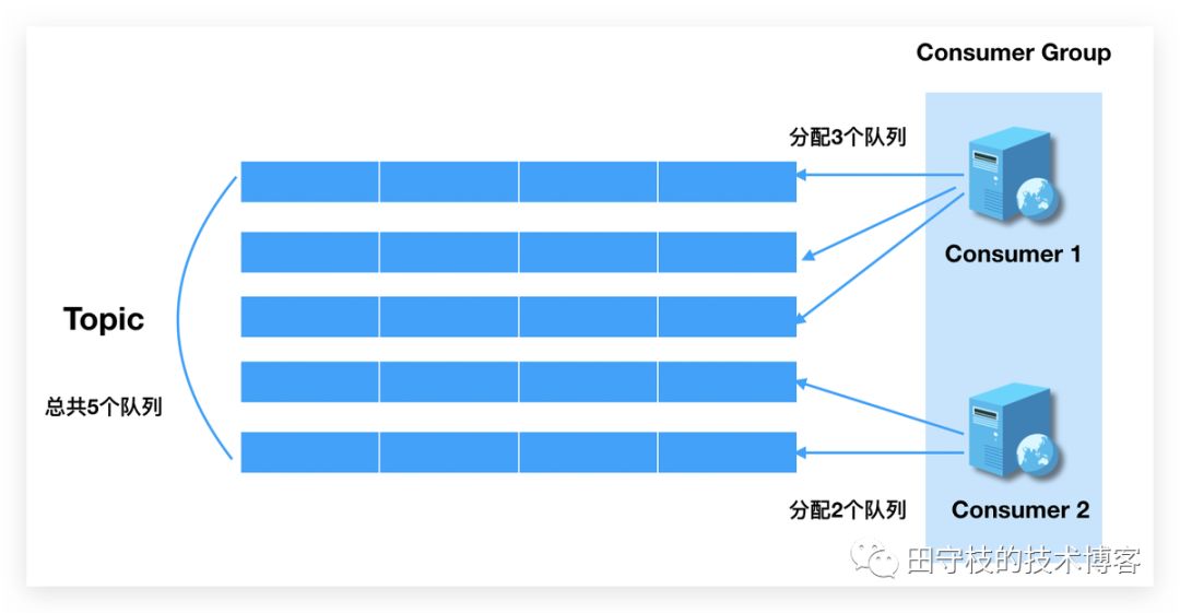 Rebalance机制本意是为了提升消息的并行处理能力。例如,一个Topic下5个队列,在只有1个消费者的情况下,那么这个消费者将负责处理这5个队列的消息。如果此时我们增加一个消费者,那么可以给其中一个消费者分配2个队列,给另一个分配3个队列,从而提升消息的并行处理能力。如下图:
