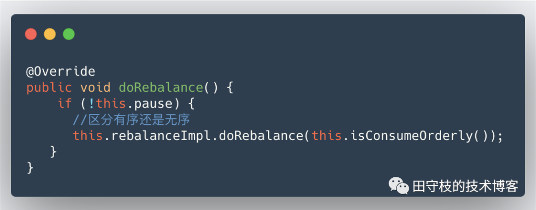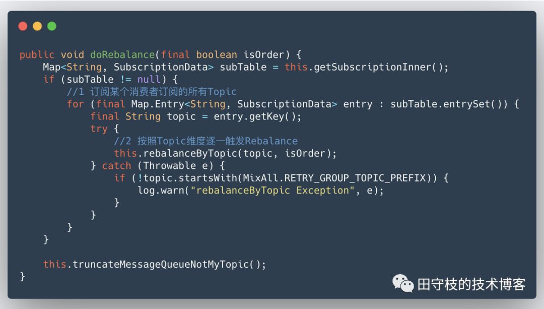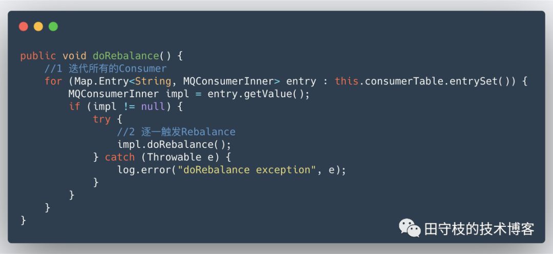 前面花了大量的篇幅,讲解了Rebalance元数据维护,Broker通知机制,以及Consumer的Rebalance触发时机,目的是让读者有一个更高层面的认知,而不是直接分析单个Consumer Rebalance的具体步骤,避免一叶障目不见泰山。 4.1 Rebalance流程整体介绍 不同的触发机制最终底层都调用了MQClientInstance的doRebalance方法,而在这个方法的源码中,并没有区分哪个消费者组需要进行Rebalance,只要任意一个消费者组需要Rebalance,这台机器上启动的所有其他消费者,也都要进行Rebalance。相关源码如下所示:MQClientInstance#doRebalance
