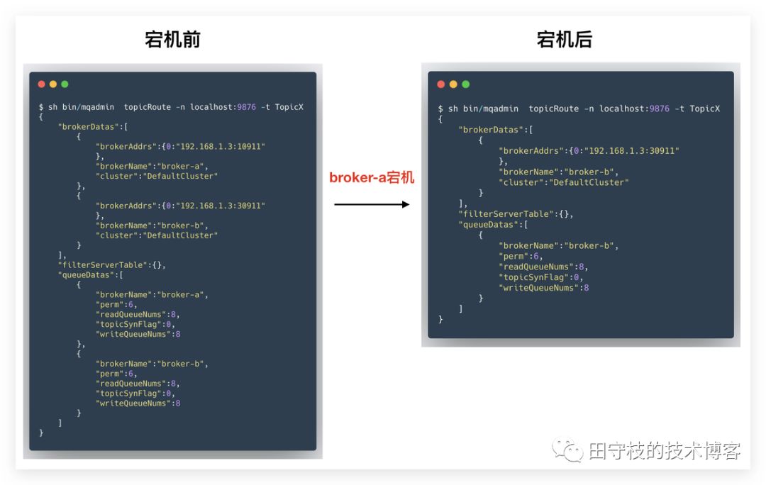队列信息通过Broker内的TopicConfigManager来维护,每个Broker都会将自己的信息上报给NameServer,由NameServer组装成完整的Topic路由信息。 通常情况下,一个Topic下的队列数量不会频繁的变化,但是如果遇到,Topic队列数量扩/缩容,、broker日常运维时的停止/启动或者broker异常宕机,也有可能导致队列数量发生变化。 这里我们重点讲一下为什么broker异常停止/宕机会导致数量变化。一些读者可能会认为创建Topic时,已经明确指定了队列的数量,那么之后不论怎样,队列的数量信息都不会发生变化,这是一种典型误解。 下图展示了一个RocketMQ集群双主部署模式下,某个broker宕机后,Topic路由信息的变化。2.2 消费者组信息变化