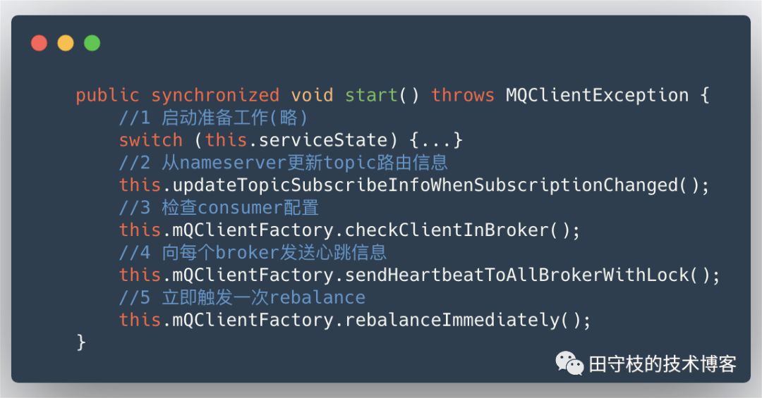 可以看到Consumer启动主要分为5个步骤,其中步骤2、4、5是我们分析的重点。: