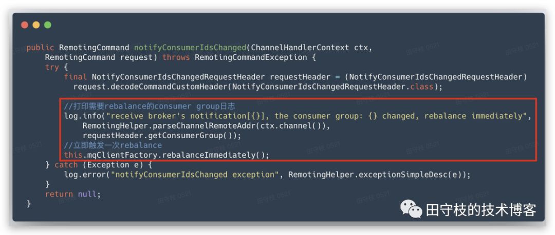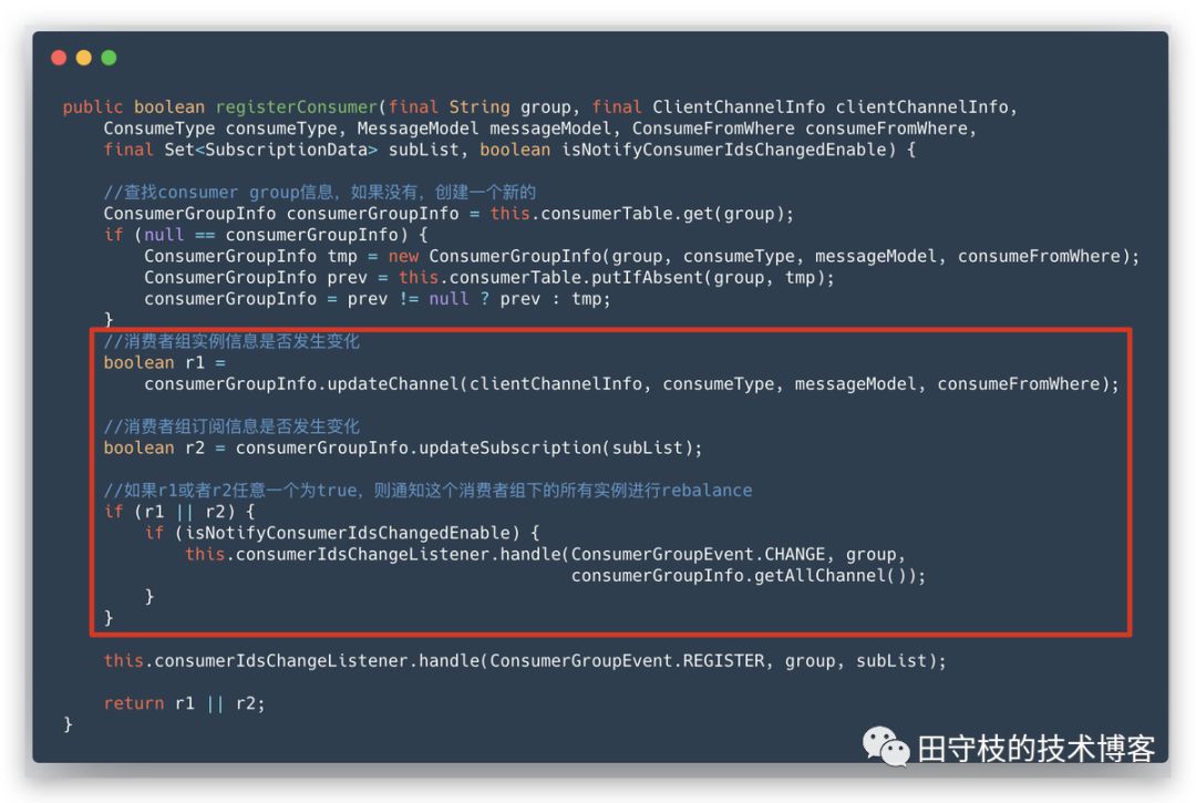 当Broker收到心跳请求后,将这个消费者注册到ConsumerManager中,前文提到,当Consumer数量变化时,Broker会主动通知其他消费者进行Rebalance。