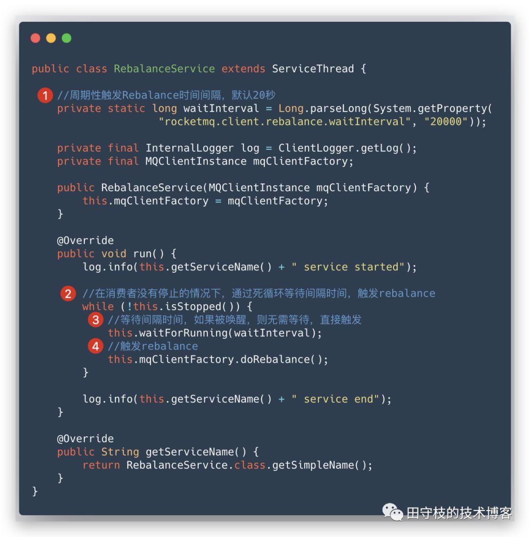 为了避免Broker的Rebalance通知丢失问题,客户端还会通过RebalanceService定时的触发Rebalance,默认间隔是20秒,如下图:3.3 停止时触发