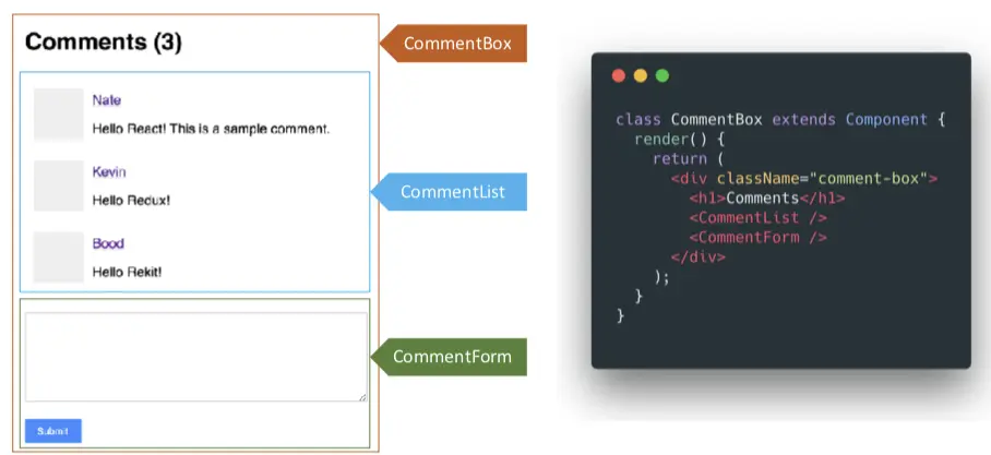 下面的评论框由CommentBox、CommentList和CommentForm三个组件共同完成,代码部分除了div和h1标准的html的tag外还有CommentList和CommentForm两个自定义组件共同完成。