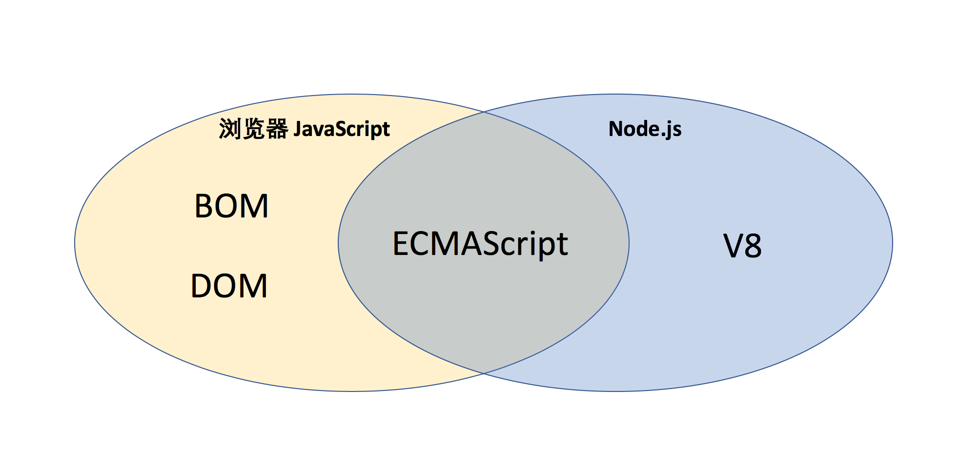 简单地说,Node(或者说 Node.js,两者是等价的)是 JavaScript 的一种运行环境。在此之前,我们知道 JavaScript 都是在浏览器中执行的,用于给网页添加各种动态效果,那么可以说浏览器也是 JavaScript 的运行环境。那么这两个运行环境有哪些差异呢?请看下图: