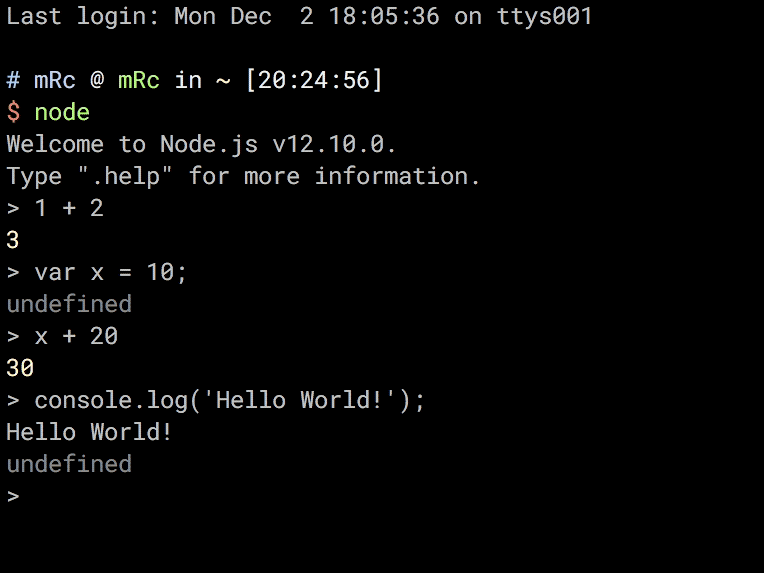 然后,我们还可以进入 Node REPL(直接输入 node),然后输入任何合法的 JavaScript 表达式或语句: