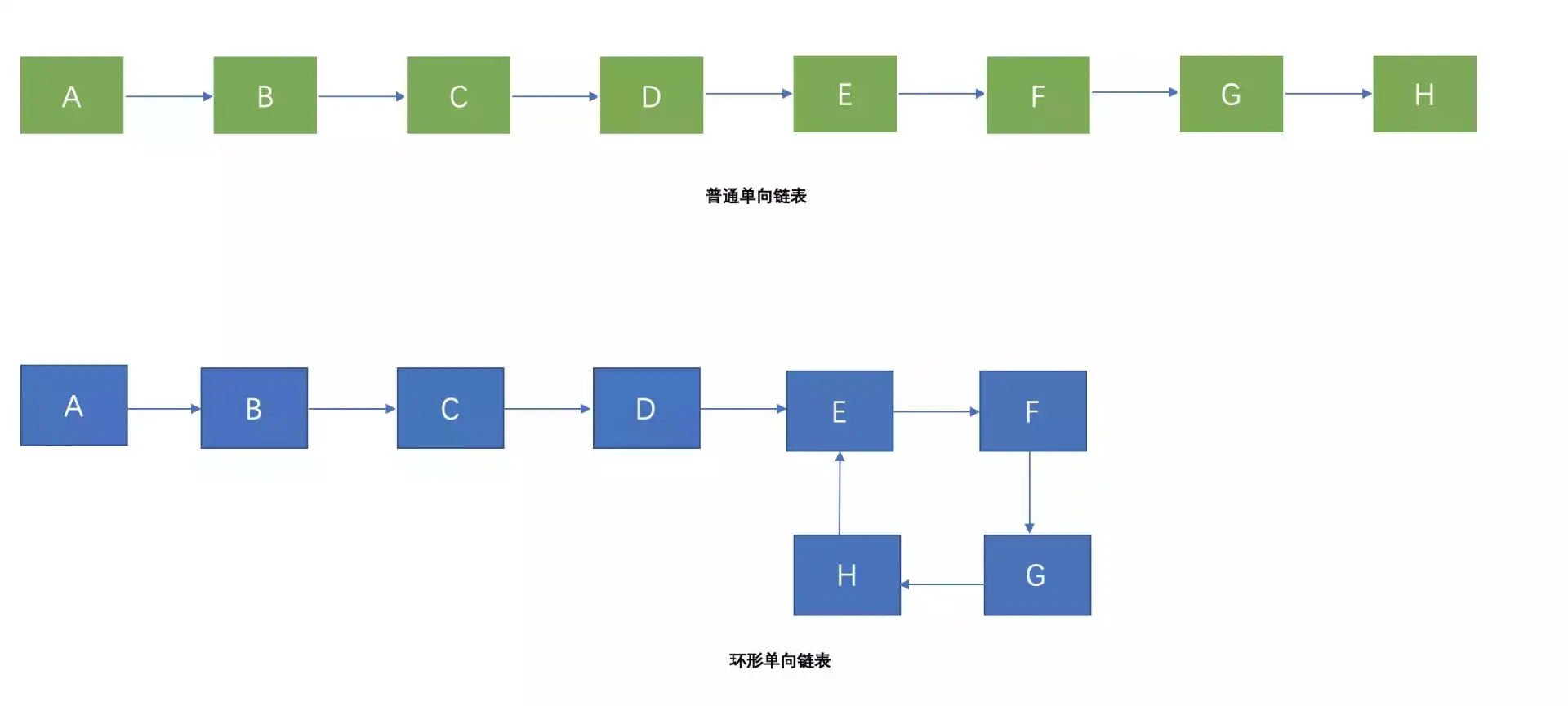 首先我们来画一个普通的单向链表和环状链表的结构图: