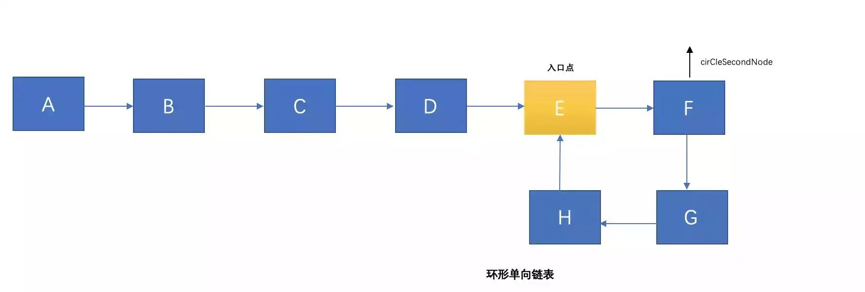 可以看出在环形单向链表的EFGH形成了一个环状,那么如何用程序判断它成环呢?