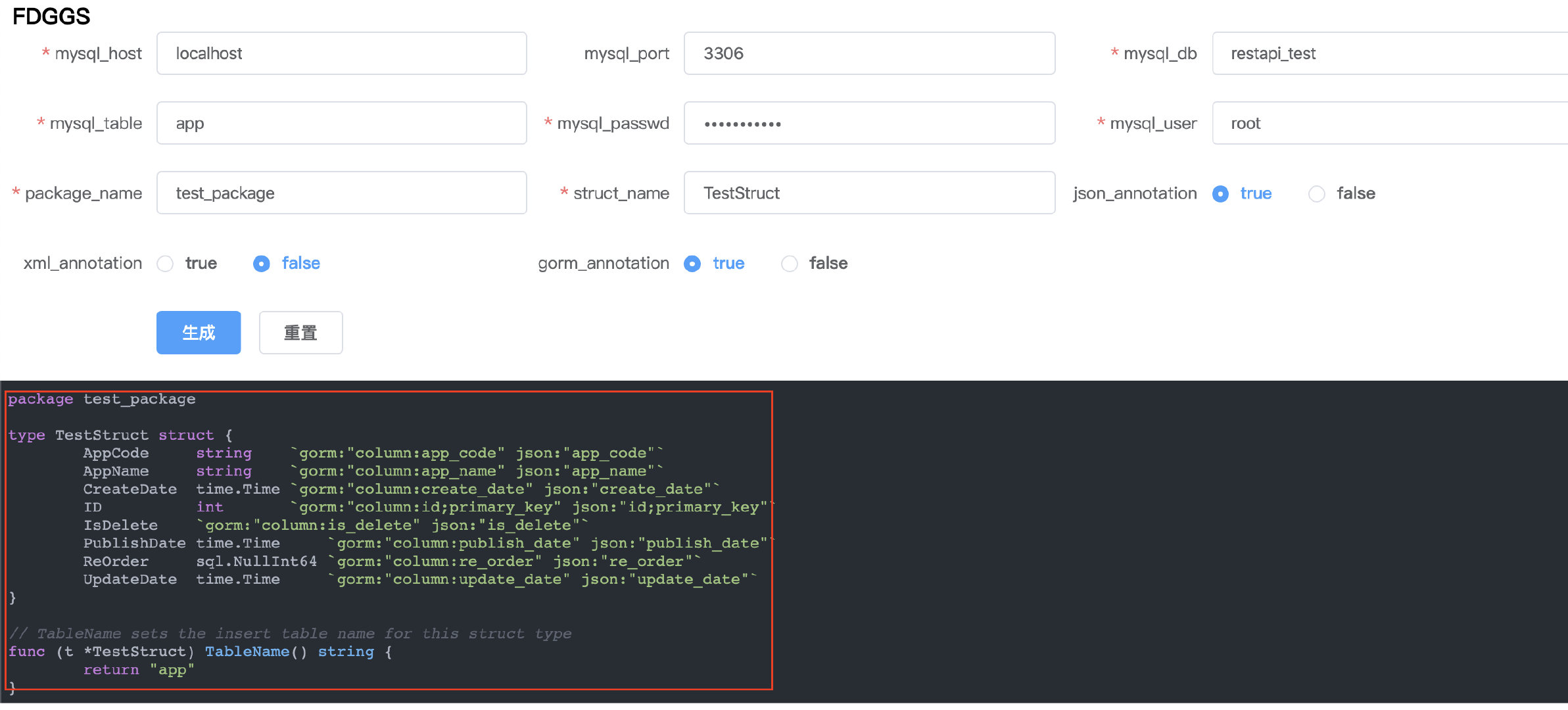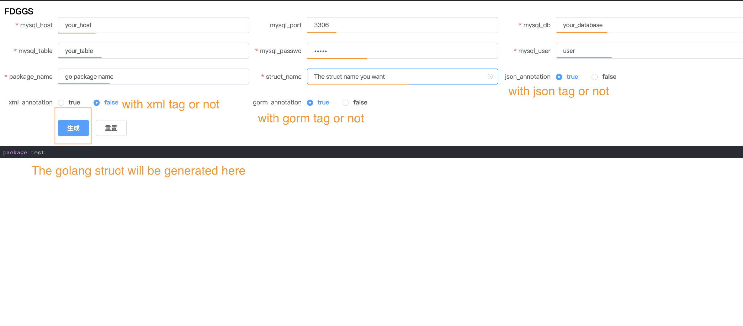 fuckdb generates a go compatible struct type with the required column names, data types, and annotations just fill in the database information in the web UI. Making go web develop very easy by saving a lot of time writing structure.fuckdbis based/inspired by the work of Seth Shelnutt's db2struct, and Db2Struct is based/inspired by the work of ChimeraCoder's gojson package gojson.