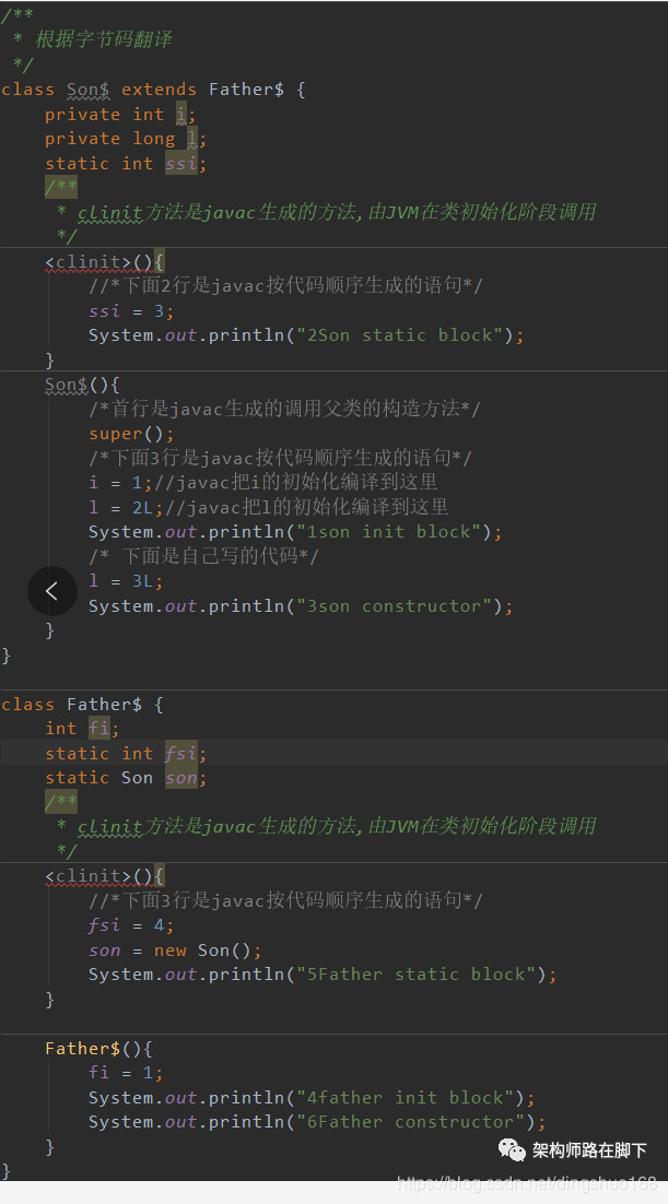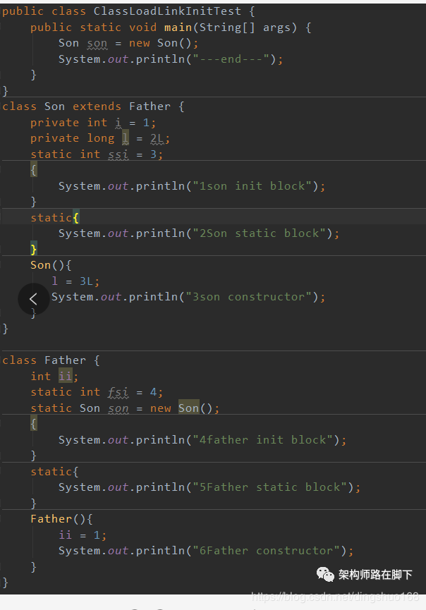 其实很多人最大的疑问是在“ static Son son = new Son();”这行代码,这里不用纠结,虚拟机规范并没有规定类初始化阶段 不能执行创建对象的逻辑。说白了,类初始化就是JVM执行代码的过程,没什么特别的。