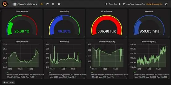 使用Grafana的气候站仪表板 (https://developers.bigclown.com/integrations/grafana-for-visualization)