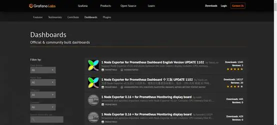 Grafana还拥有由社区构建的仪表板,可以通过数据源、面板类型、类别和收集器来选择它们。可以在这里浏览一些仪表板。