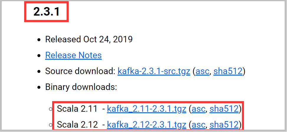 因为Kafka是由Scala语言编写的,图中的2.11和2.12指的是Scala的版本,意思就是由Scala2.11或2.12编译出的Kafka2.3.1二进制版本,而2.3.1才是Kafka的版本。