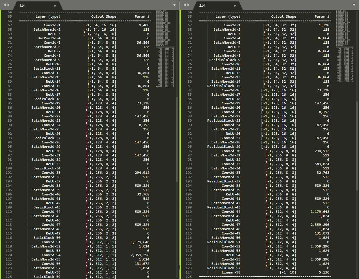 事情的起因是这样的:这段时间需要查看一下网络内部的具体工作方式,所以需要重新使用cifar10训练一个网络。正好前两天读了一下resnet在pytorch中的官方实现,发现其中用了一个AdaptiveAvgPool2d导致网络输入可以被视为任意的,因此我直接用torchvision.models定义的resnet18进行训练。开始一切都很顺利,但是过拟合严重,正确率到55%左右,loss再降但是acc就不升高了。我以为是我的参数没对,找到【Pytorch】ResNet-18实现Cifar-10图像分类进行测试。真香,人家代码就是好。但是我进一步发现不对啊,我的代码换成他的参数,还是不对(实测效果好不少,但是训练不稳定,而且收敛速度远远慢于它)。难道是模型有问题? 换了模型,真香too,人家的模型真好用。不过官方给我的resnet18难道有错???然后在滚滚暖风(容易困)下我开始了模型内部的掉坑,爬出坑,把坑填上土的工作(其实我现在还没填上,只知道我掉到哪个坑了)。 最开始我通过: