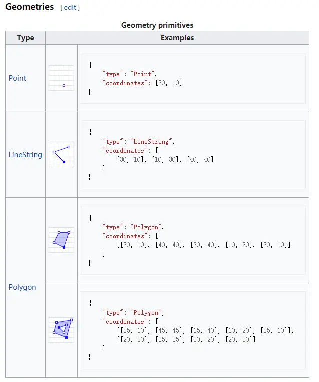 可以看出,features数组中存储了绘制信息,这些绘制信息是如何绘图的呢?维基百科中也给出了相关示例,即通过type控制绘制类型,coordinates控制点、路径、形状。