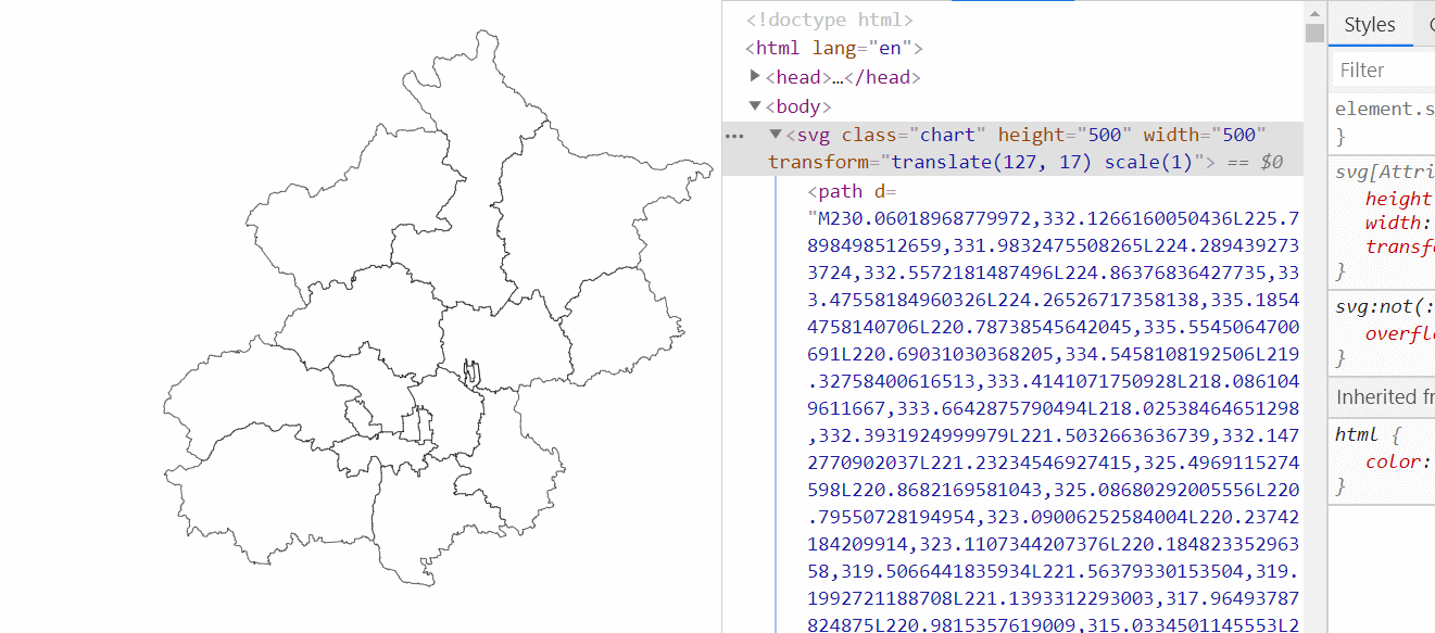 接下来来到绘图的一步了,svg中的地图是用path元素勾勒的,我们