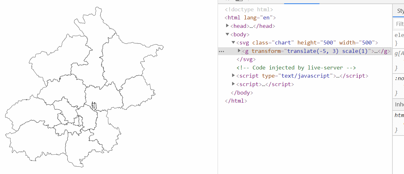 我们在原来的svg中插入<g>标签,把地图的path路径放在<g>标签中,事件仍然挂载在svg上,而拖拽、缩放时应用于<g>元素即可,这样被监听元素的位置就不会改变了。