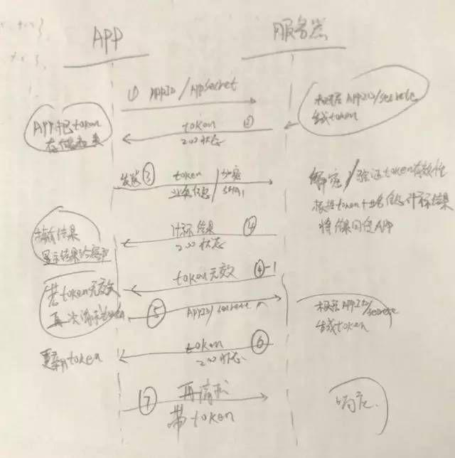 APP登录的时候发送加密的用户名和密码到服务器,服务器验证用户名和密码,如果成功,以某种方式比如随机生成32位的字符串作为Token,存储到服务器中,并返回Token到APP,以后APP请求时,凡是需要验证的地方都要带上该Token,然后服务器端验证Token,成功返回所需要的结果,失败返回错误信息,让他重新登录。