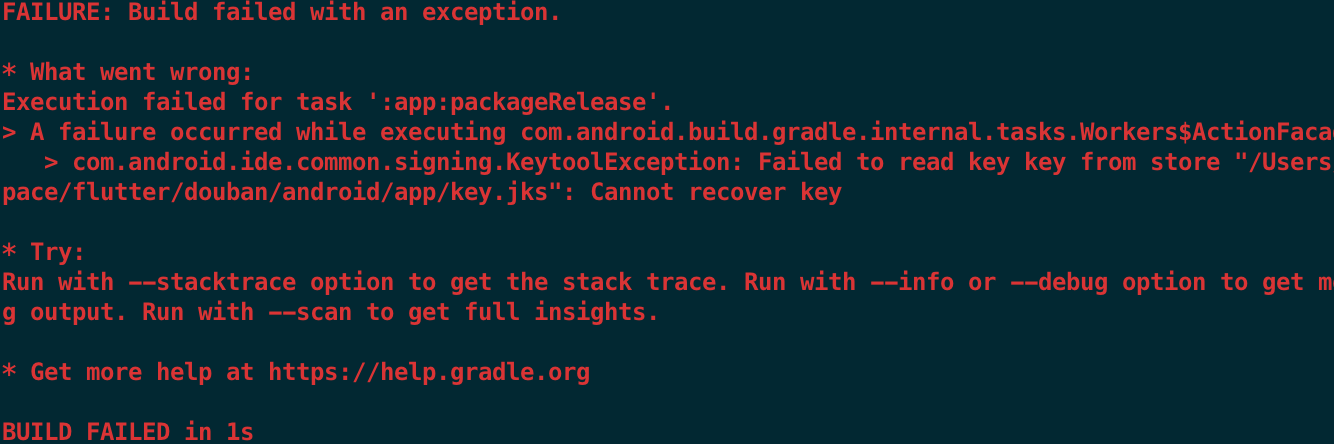 futter 打包报错解决 一颗Potato 2019-12-15 229 阅读1分钟 flutter 打包报如下错误 最后排查发现是key.properties中密码写错了(密码后面多空格也是不行的),密码修改正确后打包成功