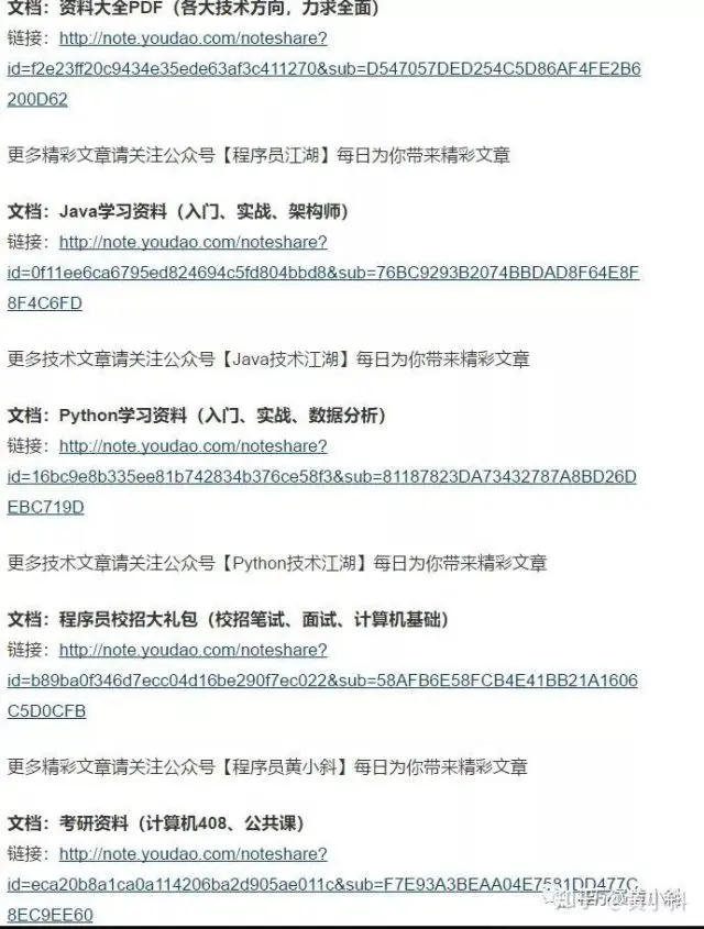 以下资料都将会整理到《程序员黄小斜2019学习资料》中,只需关注微信公众号【程序员黄小斜】后回复【2019】即可领取所有资料,没有其他套路,应该算是比较良心了。