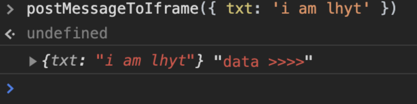 打开父页面,执行postMessageToIframe({ txt: 'i am lhyt' }),即可看见控制台有子页面的反馈: