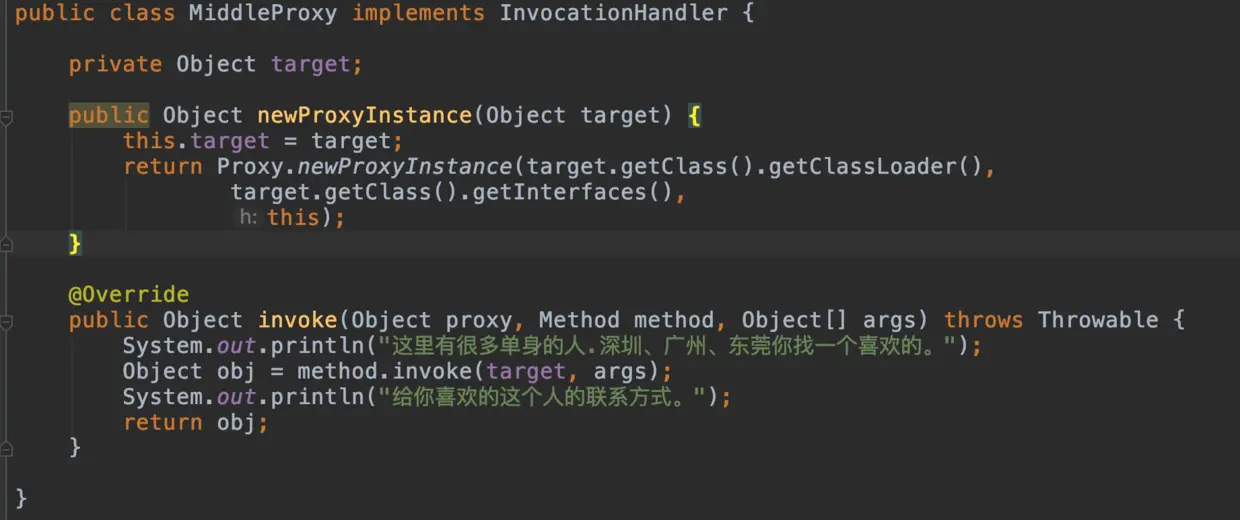 public class MiddleProxy implements MethodInterceptor { .... public Object intercept(Object o, Method method, Object[] objects, MethodProxy methodProxy) throws Throwable { System.out.println("这里有很多单身的人.深圳、广州、东莞你找一个喜欢的。"); Object obj = methodProxy.invokeSuper(o, objects); System.out.println("给你喜欢的这个人的联系方式。"); return obj; } }