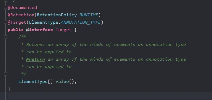 看一下里面有一个Value参数,它的返回值为ElementType[] , ElementType就是上面的枚举类。