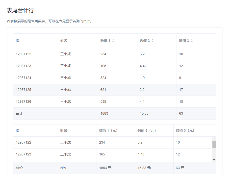 将show-summary设置为true就会在表格尾部展示合计行。默认情况下,对于合计行,第一列不进行数据求合操作,而是显示「合计」二字(可通过sum-text配置),其余列会将本列所有数值进行求合操作,并显示出来。当然,你也可以定义自己的合计逻辑。使用summary-method并传入一个方法,返回一个数组,这个数组中的各项就会显示在合计行的各列中,具体可以参考本例中的第二个表格。